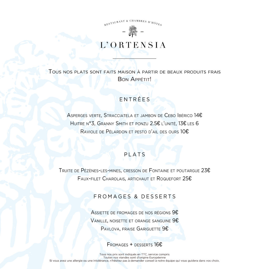 À L’Ortensia, nous proposons une cuisine sincère et raffinée, pleinement inspirée par les produits de terroir et les saisons. Chaque plat est fait maison, préparé avec soin et créativité pour ravir vos papilles dans une ambiance convivial et détendue.
