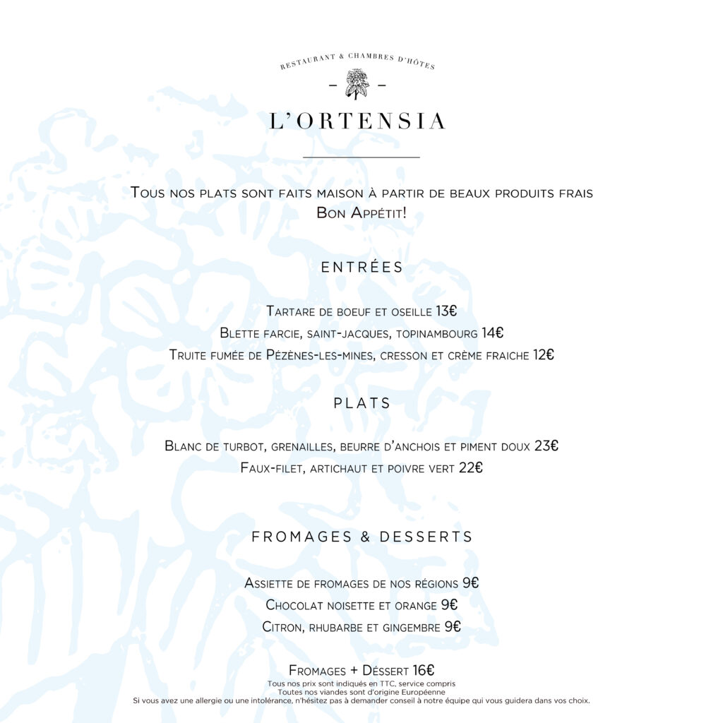 À L’Ortensia, nous proposons une cuisine sincère et raffinée, pleinement inspirée par les produits de terroir et les saisons. Chaque plat est fait maison, préparé avec soin et créativité pour ravir vos papilles dans une ambiance convivial et détendue.