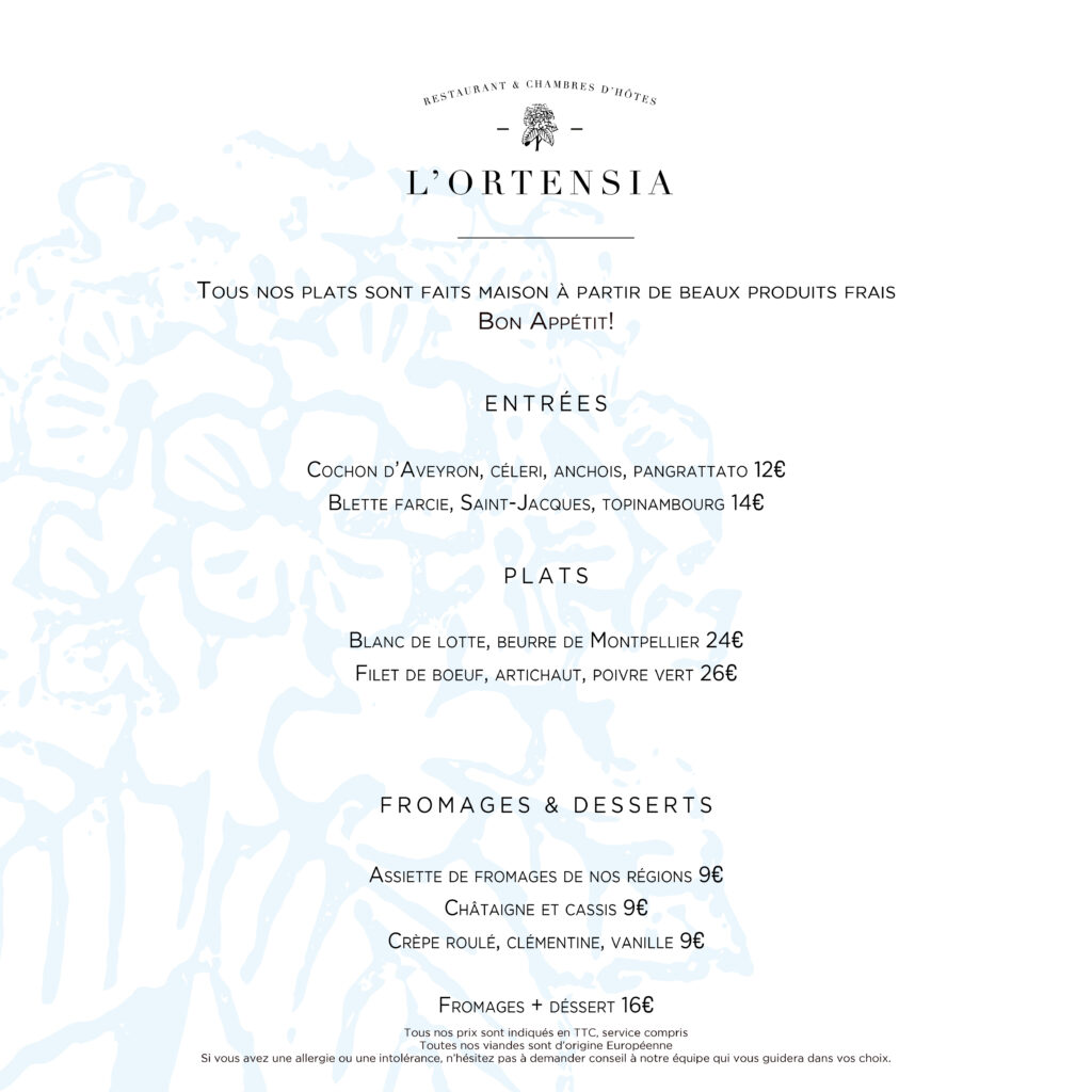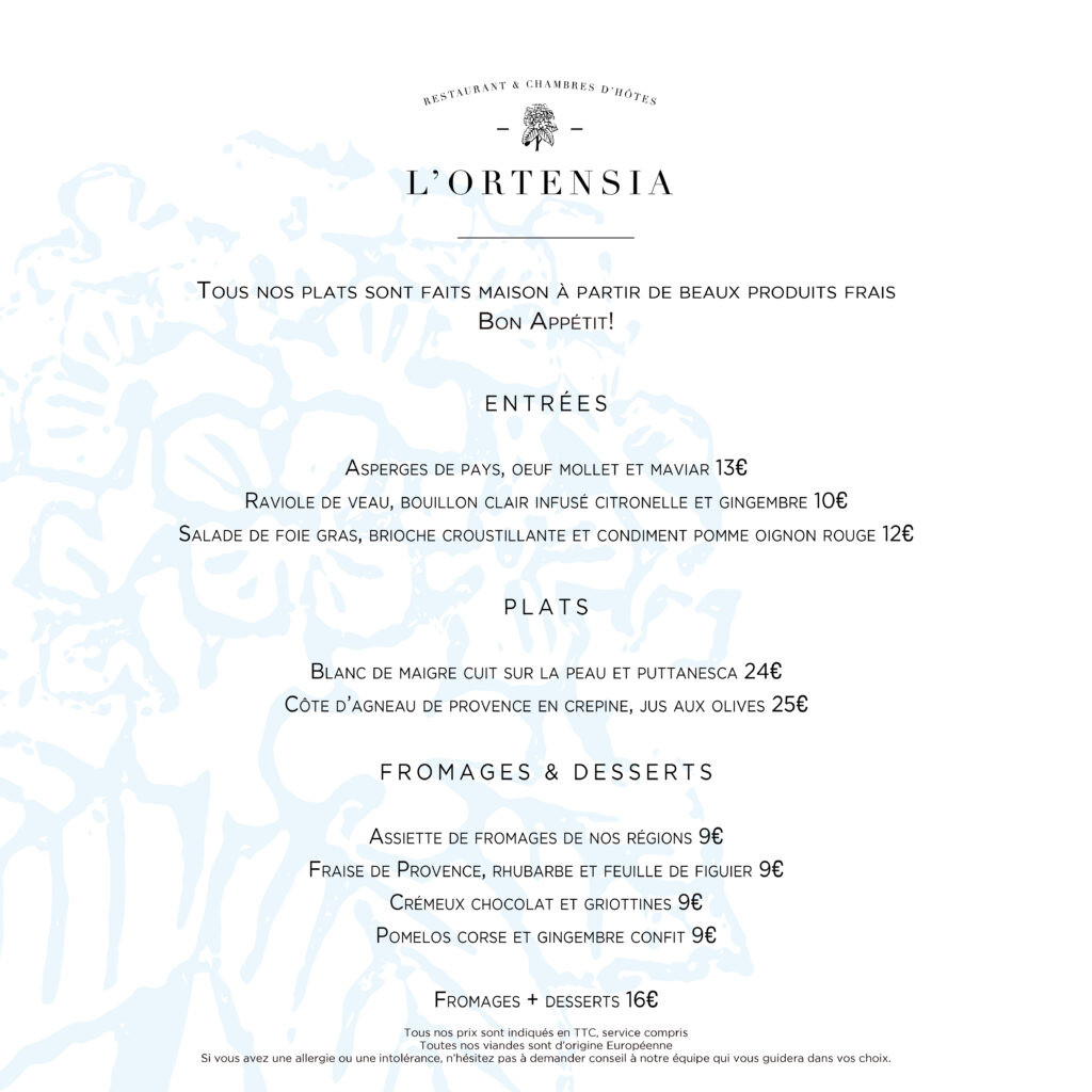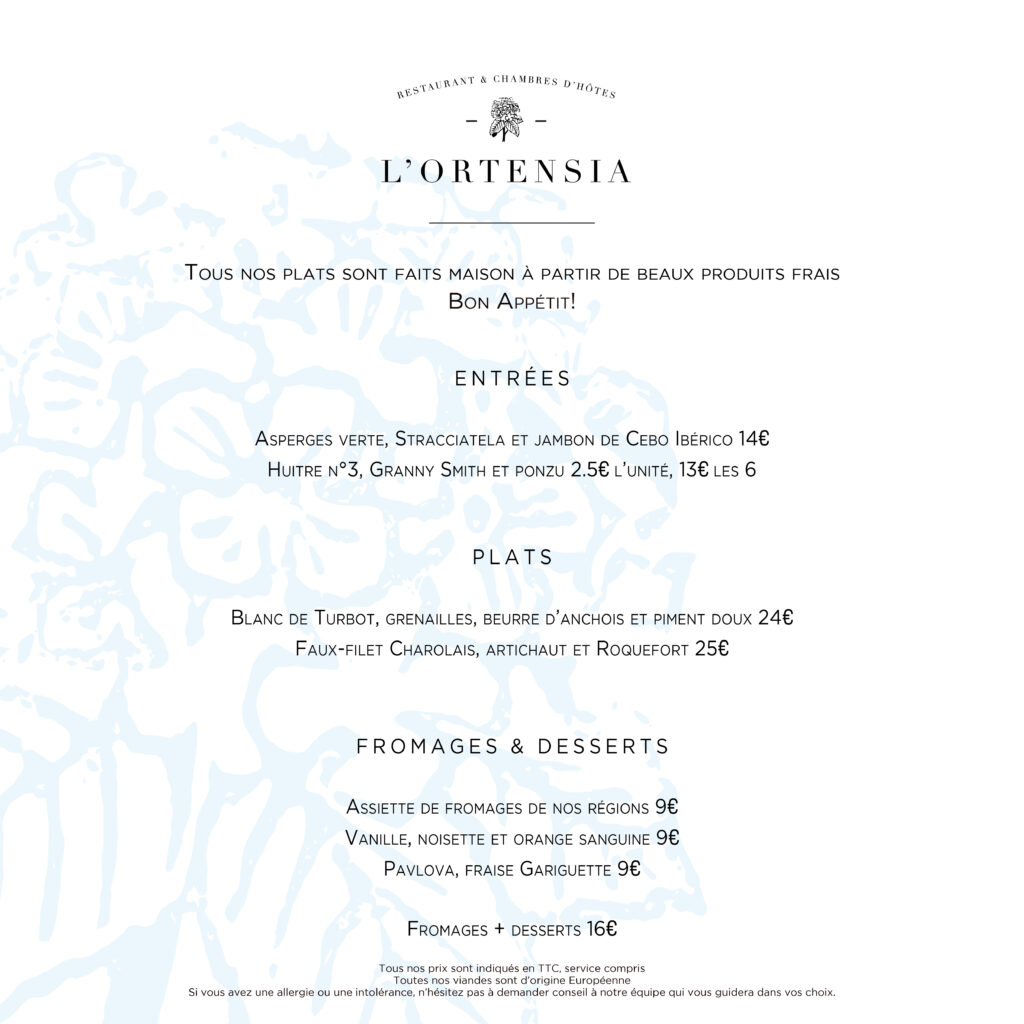 À L’Ortensia, nous proposons une cuisine sincère et raffinée, pleinement inspirée par les produits de terroir et les saisons. Chaque plat est fait maison, préparé avec soin et créativité pour ravir vos papilles dans une ambiance convivial et détendue.